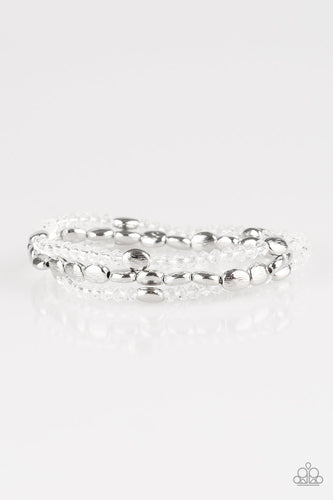 HELLO BEAUTIFUL - WHITE CRYSTAL BEAD SILVER STRETCHY BRACELET - PAPARAZZI