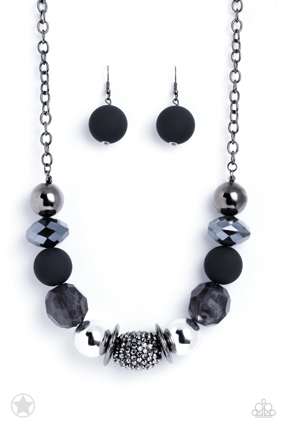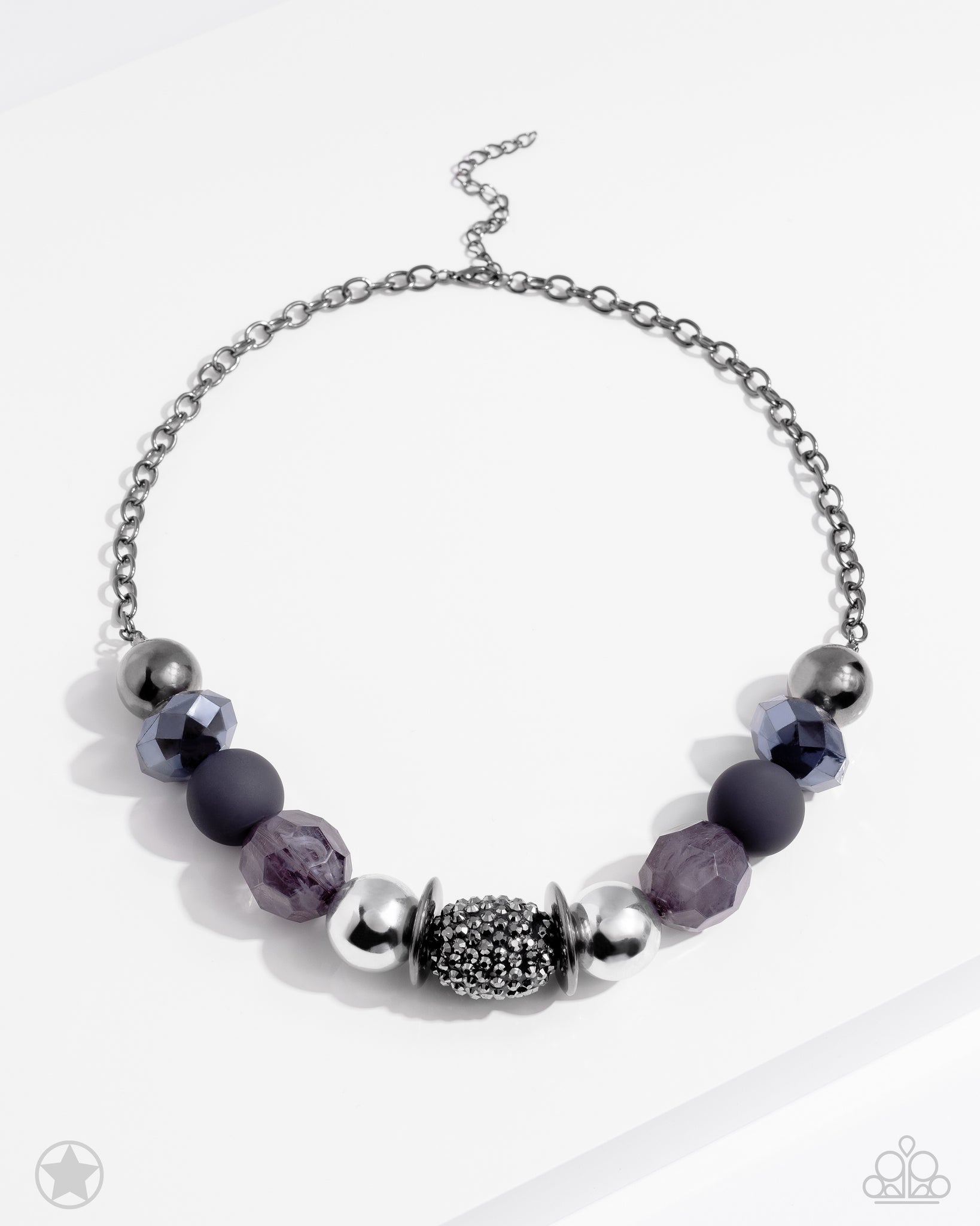 Sophisticated beads in shades of gunmetal and black with reflective faceted edges and varying glazed finishes are offset by two shiny silver beads. An oblong bead studded with gunmetal rhinestones adds a dramatic accent. Features an adjustable clasp closure.
