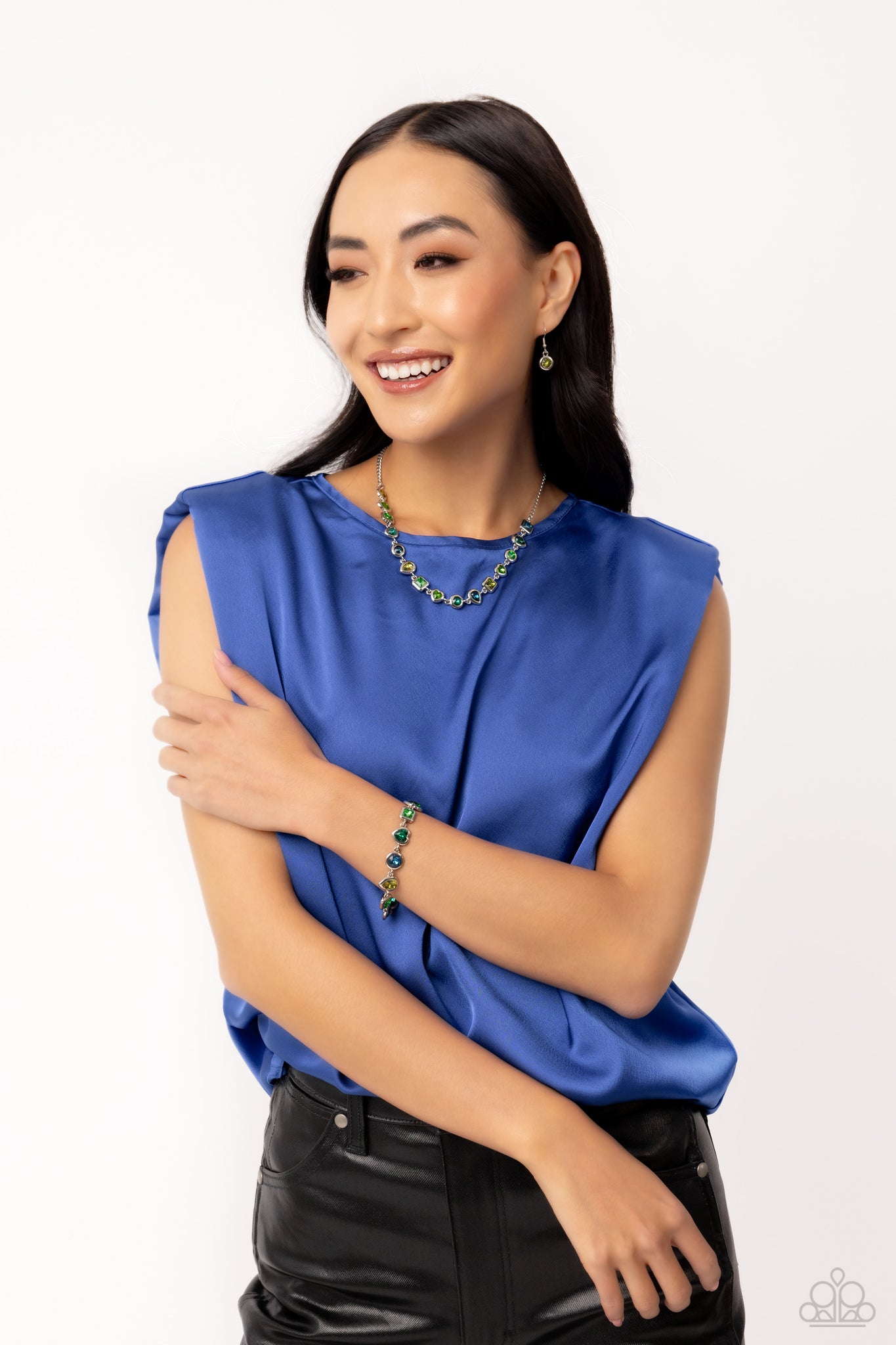 Featuring various shapes and shades of green, a collection of teardrop, round, heart, and square-cut gems in matching silver frames coalesce around the neckline for an abstract display of color and charm. Features an adjustable clasp closure.