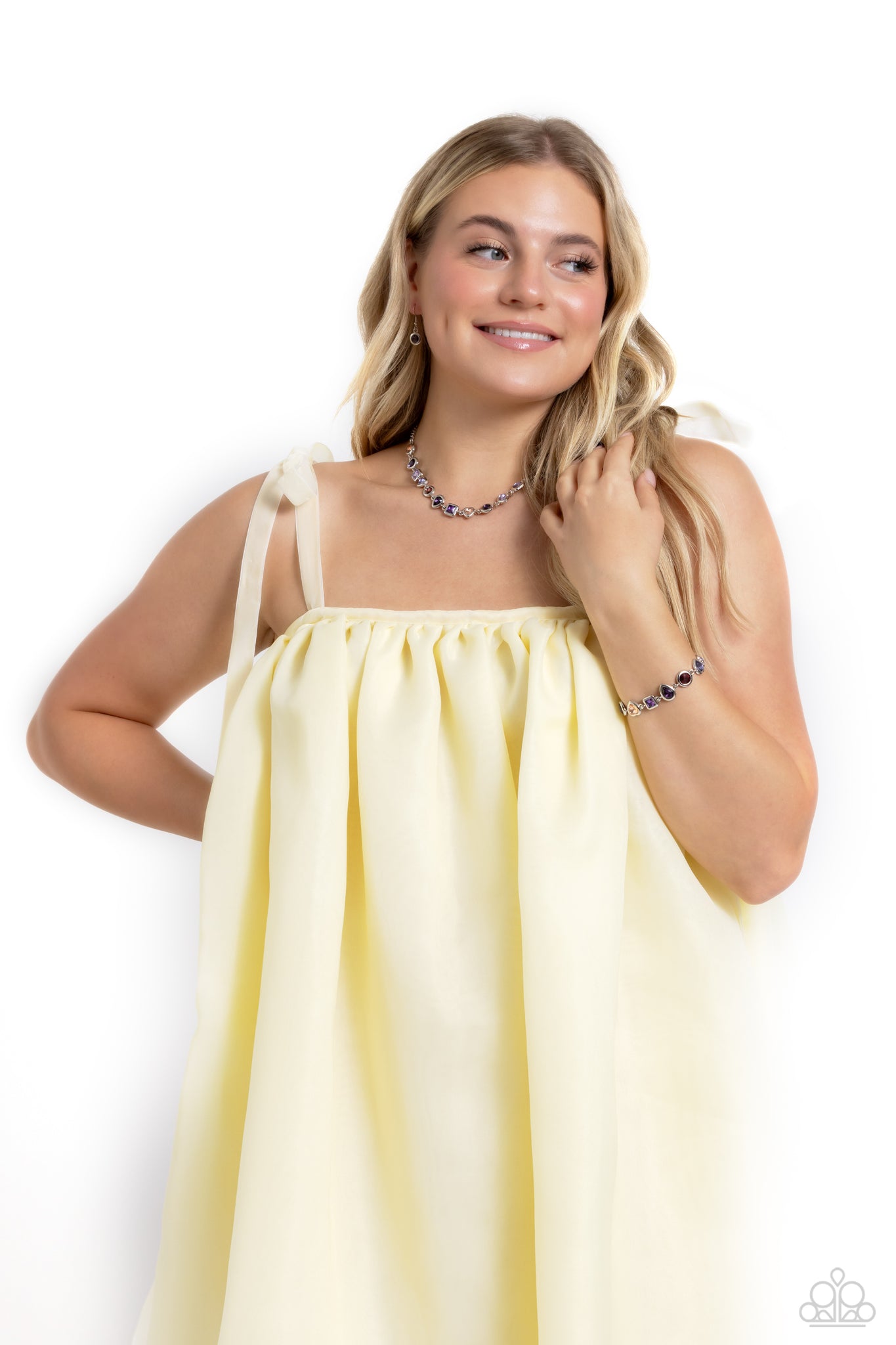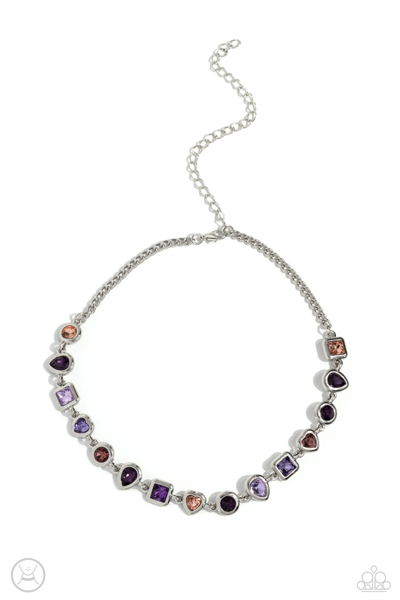 Featuring various shapes and shades of purple, a collection of teardrop, round, heart, and square-cut gems in matching silver frames coalesce around the neckline for an abstract display of color and charm. Features an adjustable clasp closure.