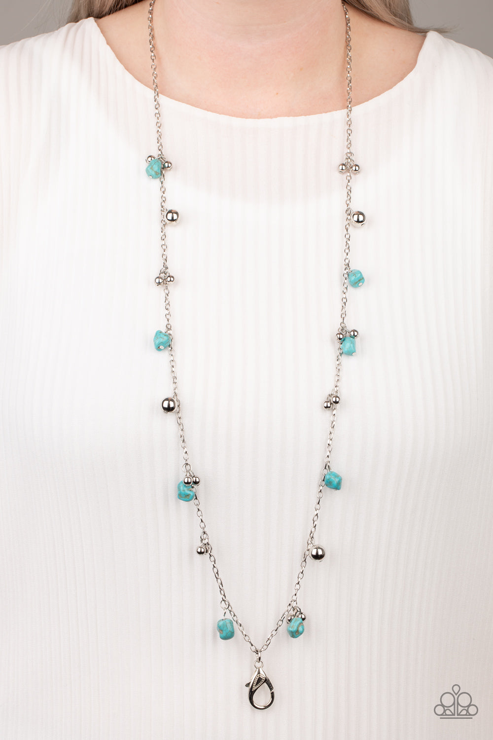 Refreshing turquoise pebbles and an array of glistening silver beads trickle along a lengthened silver chain for a seasonal look. A lobster clasp hangs from the bottom of the design to allow a name badge or other item to be attached. Features an adjustable clasp closure.